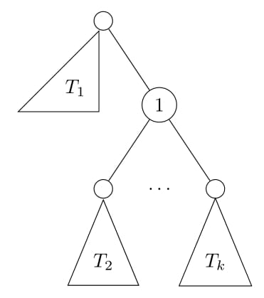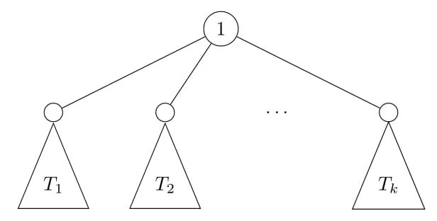Re-rooting DP의 핵심 아이디어는 다음과 같다. 일단 1번 정점을 루트로 하는 일반적인 트리 DP를 통해 값을 구해놓은 상태라고 하자. 그렇다면 Figure 1과 같은 상황에서 각 서브트리 $T_1,T_2,\ldots,T_k$에 대한 정답은 이미 구해져 있을 것이다. 이때 트리의 루트를 서브트리 $T_1$ 의 루트로 바꾼다고 하자. 그러면 트리는 Figure 2와 같이 변하게 된다. Figure 1에서 Figure 2로 바뀌었을 때 이전의 트리에서 새롭게 계산해야 할 부분이 얼마나 되는지 생각해보면, 1번 정점을 루트로 하는 서브트리와 새로운 루트의 서브트리(=전체 트리) 이렇게 2부분만 업데이트하면 됨을 알 수 있다. 즉, 모든 계산을 다시 할 필요가 없다는 뜻이다.