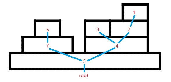 문제의 주어진 조건을 잘 살펴보면 주어진 요새는 반드시 트리의 형태를 띄게 됨을 알 수 있다. 아무런 블럭이 없는 땅을 root 라고 하면, 각 블럭에 대하여 자신의 바로 위에 직접적으로 쌓인 블럭이 자신의 자식 노드가 된다. 문제에 주어진 예제는 다음과 같이 거꾸로 뒤집어진 트리라고 볼 수 있다. 블럭의 번호는 예제 입력으로 주어진 번호를 사용하였다.